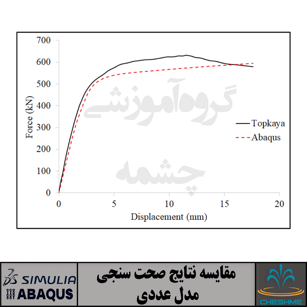 در نهایت، مقایسه نتایج مدل اجزا محدود با مدل مقاله در شکل زیر نشان داده شده است. پس از راست آزمایی در سایر مدل های مورد بررسی، به آنالیز تاثیر نوع المان و اندازه مش پرداخته شد که در فیلم آموزشی و همچنین فایل گزارش موجود است.