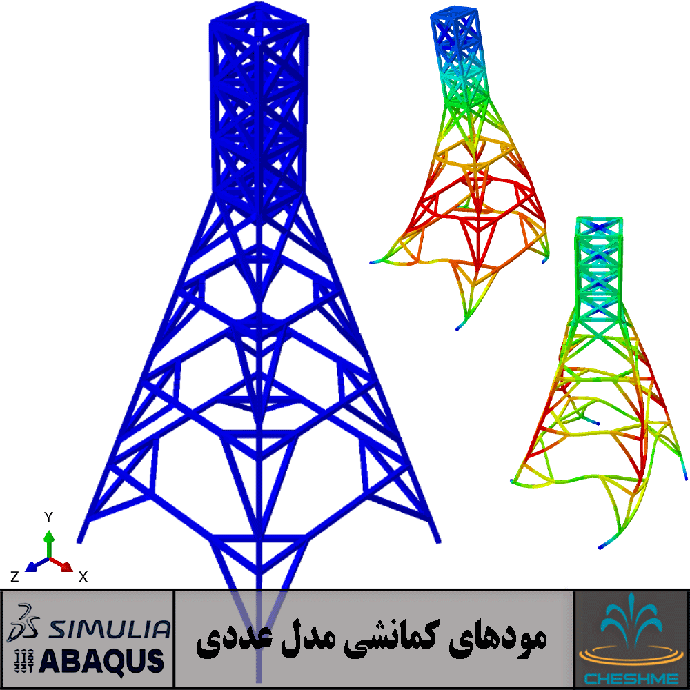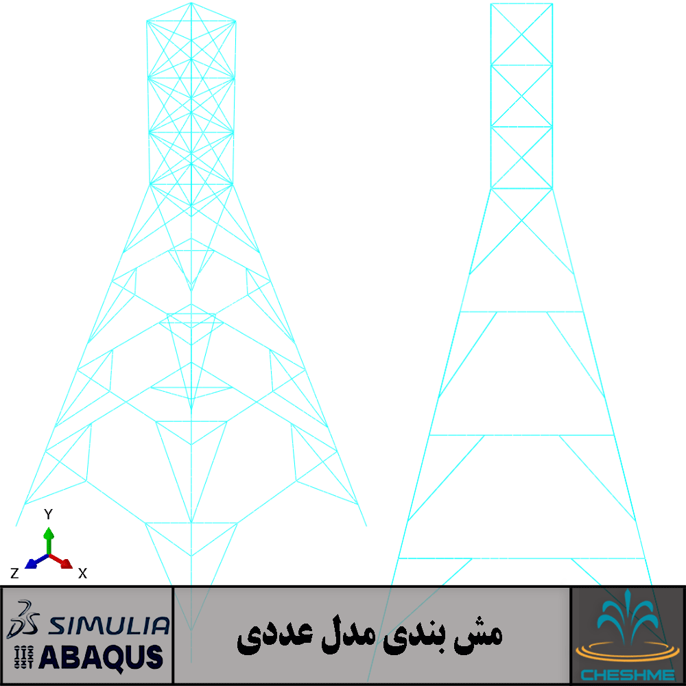 در این فیلم آموزشی، ابتدا یک دکل انتقال نیرو در نرم افزار SAP مدل میشود و سپس نمونه مدل شده در نرم افزار SAP به نرم افزار اجزاء محدود آباکوس منتقل می شود. در این بخش نحوه انتقال تمامی مدلسازی های انجام شده در نرم افزار سپ و ایتبس به نرم افزار آباکوس از جمله دکل های انتقال نیرو آموزش داده می شود. در ادامه نحوه مدل سازی صفر تا 100 مدل از ابتدا در نرم افزار آباکوس آموزش داده می شود. در نهایت با معرفی مشخصات مصالح، مش بندی، شرایط مرزی و سایر پارامترهای مورد نیاز، مودهای کمانشی ناشی از تحلیل فرکانسی با مودهای کمانشی ناشی از تحلیل مدل در نرم افزار SAP مقایسه می شود. شکل زیر نمونه مدل شده در نرم افزار آباکوس را نشان میدهد.
