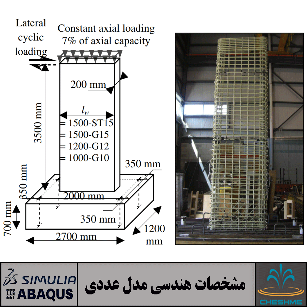 در این پژوهش بهمنظور بررسی عددی رفتار دیوار برشی بتنی به روش اجزاء محدود، یک نمونه آزمایشگاهی از دیوار برشی بتنی دارای میلگرد GFRP مربوط به پژوهش نیره محمد و همکاران در سال 2014 در کانادا، تحت اثر بارگذاری یکنواخت با استفاده از آنالیز استاتیکی غیرخطی در نرم افزار اجزاء محدود آباکوس موردبررسی قرار گرفت. در شکل زیر مشخصات هندسی مدل نشان داده شده است. همانطور که قابلمشاهده است، این نمونه دارای فونداسیون تک به ابعاد 2700 در 1200 میلیمتر و به ضخامت 700 میلیمتر میباشد. دیوار برشی بتنی به عرض 2000 میلیمتر، ارتفاع 3500 میلیمتر و ضخامت 200 میلیمتر در وسط فونداسیون قرار گرفته است.