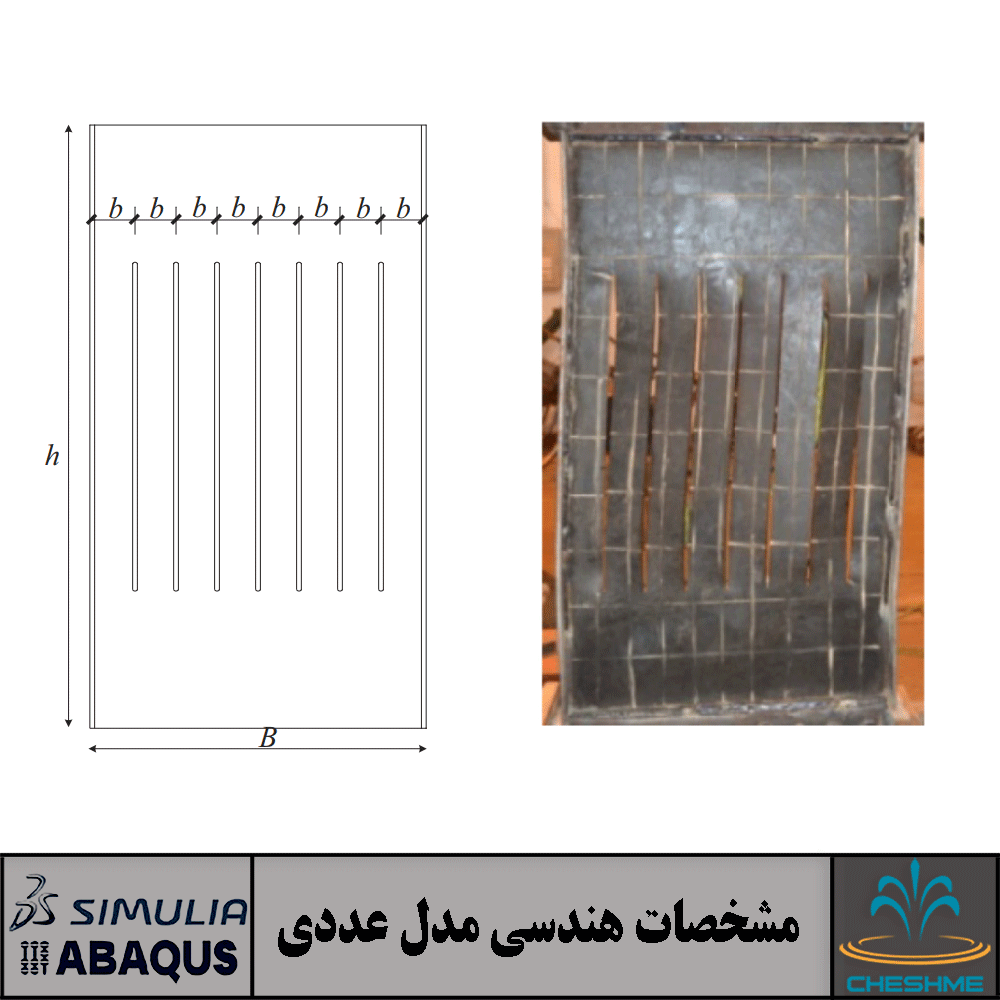 در شکل زیر نمونه آزمایشگاهی دیوار برشی فولادی دارای شیار نشان داده شده است. همانطور که قابل مشاهده است، در این نمونه آزمایشگاهی از دو ورق سخت کننده پیرامونی به عنوان ستون استفاده شده است که ورق فولادی دارای شیار با سخت کننده های پیرامونی به تیر صلب بالا متصل شده است و جک هیدرولیکی، بار را از طریق تیر صلب به نمونه اعمال می کند.