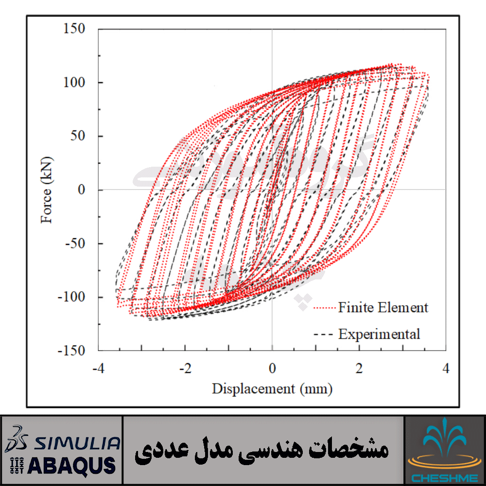 در این پژوهش نمونه تا 3/5 درصد دریفت با استفاده از روش جابجایی کنترل تحت اثر بار چرخه ای بررسی شد که در اسلایدر بالا مقایسه منحنی هیسترزیس مدل اجزا محدود با نمونه آزمایشگاهی نشان داده شده است. همانطور که قابل مشاهده است نتایج از همگرایی بسیار خوبی برخوردار بوده است.