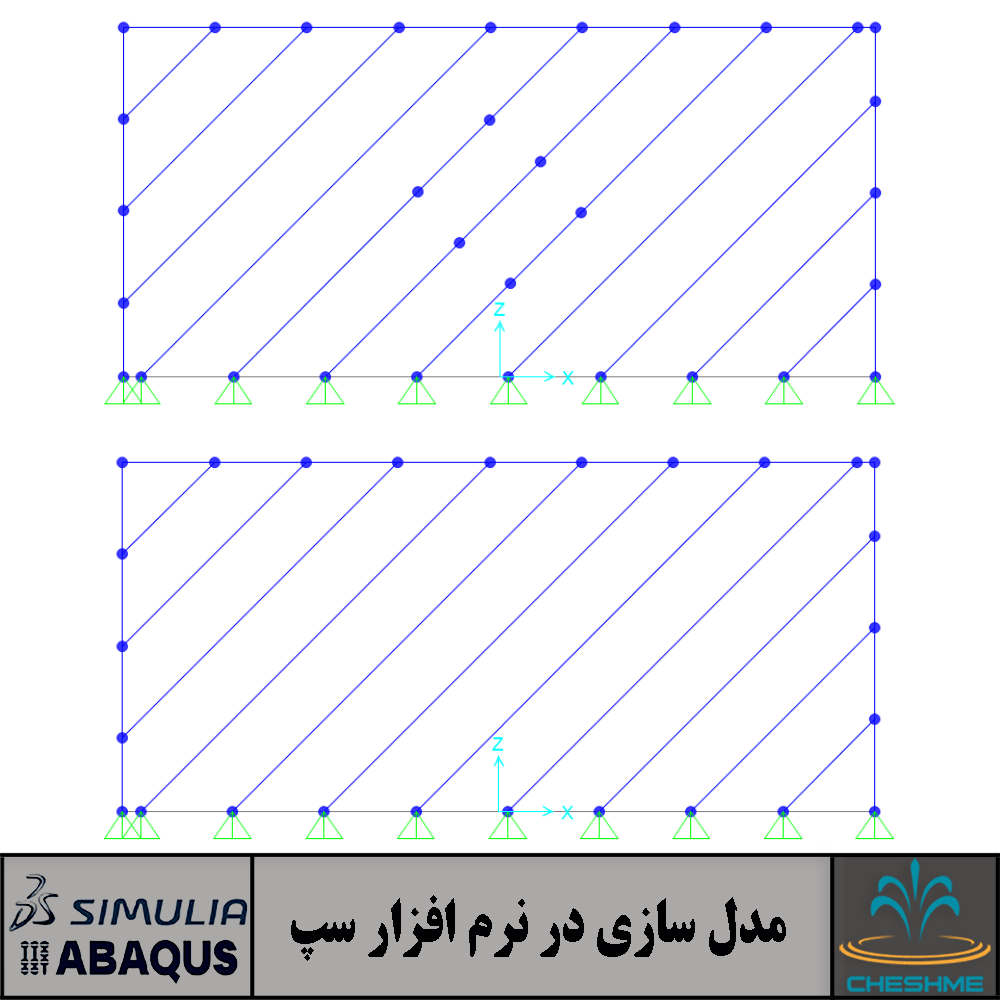 مشخصات نوارها در SAP2000 بر اساس راهنمای 20 آیین نامه امریکا محاسبه و مدل می شوند. از آنجایی که در این فیلم آموزشی از تحلیل استاتیکی غیر خطی پوش اور استفاده شده و بارگذاری در یک جهت می باشد از نوار های یک سویه برای مدل سازی پانل فولادی استفاده می شود. در این فیلم آموزشی هر سه نمونه با نتایج حاصل از نرم افزار آباکوس مقایسه شده و درصد اختلاف مقایسه می شود